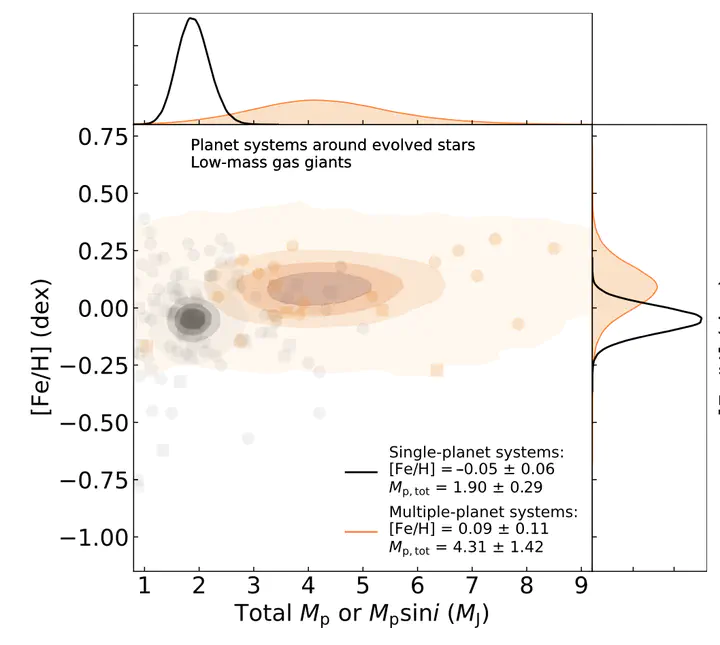 Finally, by investigating the less-massive giant planets (< 5MJ) around currently known planet-harboring evolved stars, we have found that metallicity positively correlates with the multiplicity and total planet mass of the system, which can be evidence for the core-accretion planet formation model.
